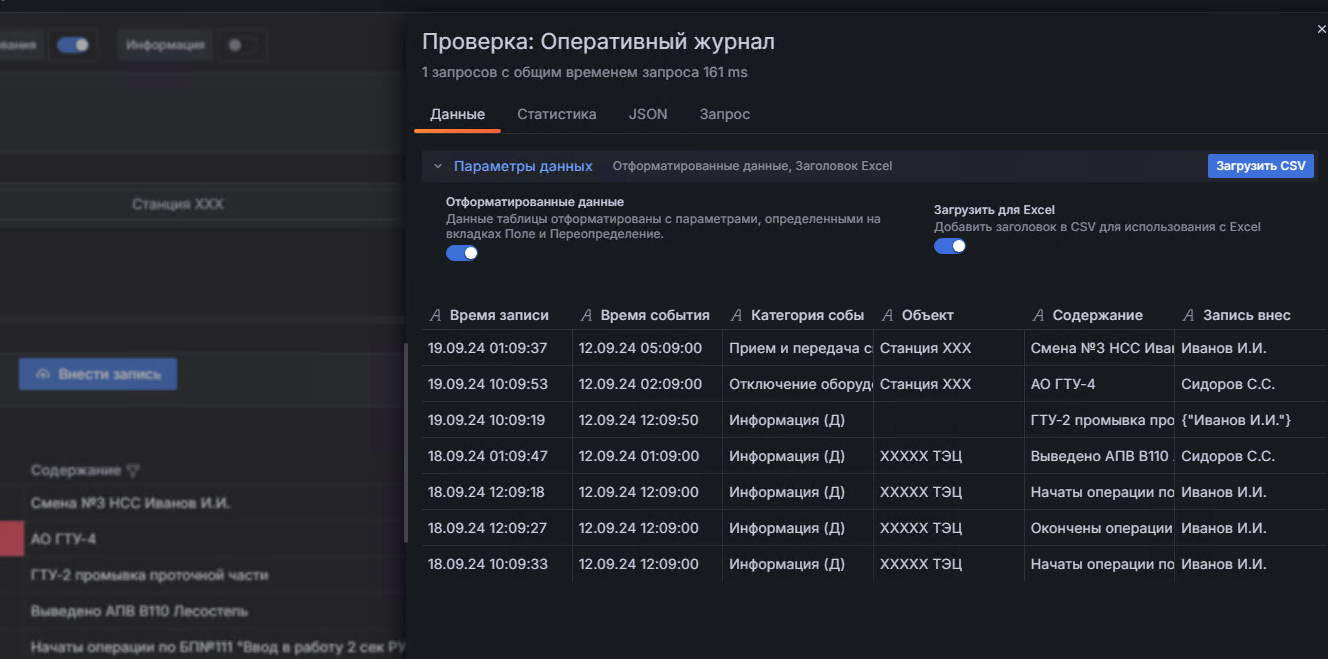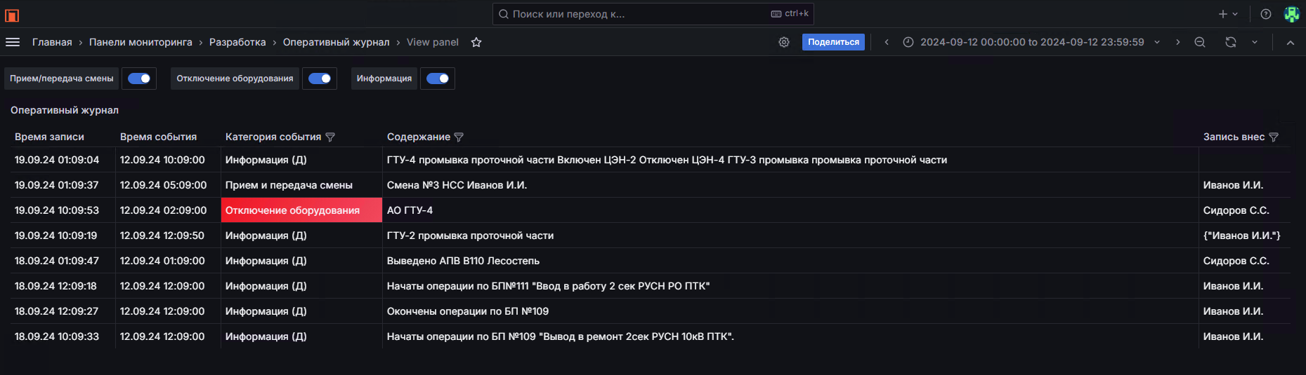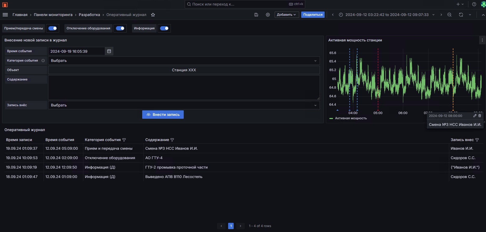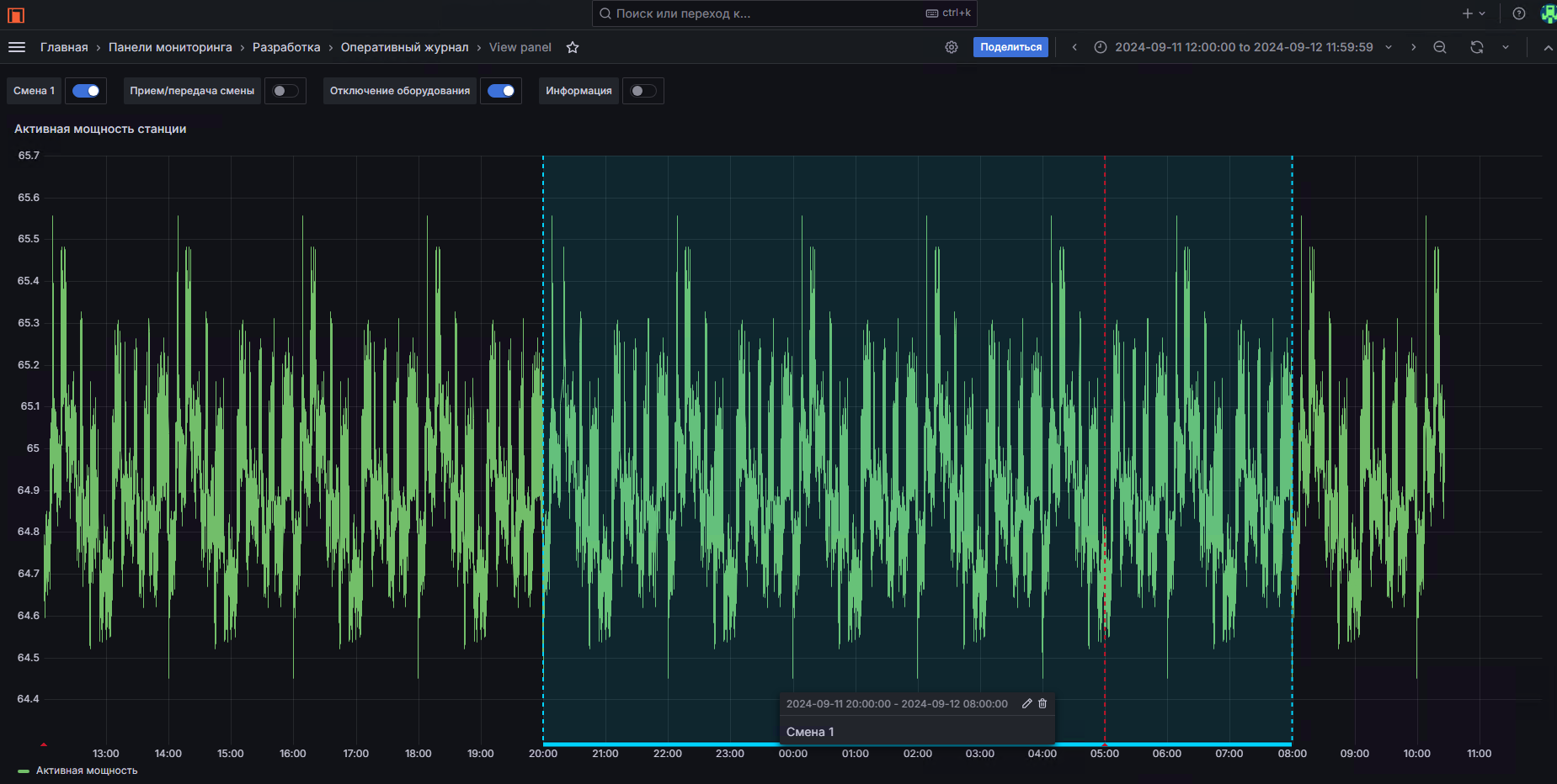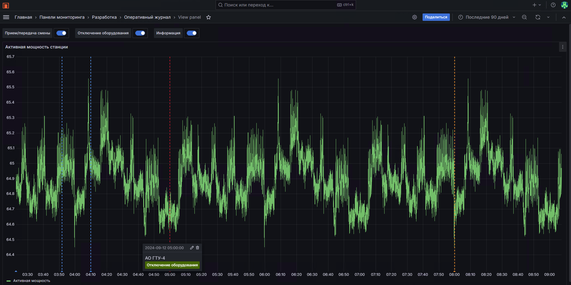 Объединение данных оперативного журнала с технологическими данными позволяет на одном экране отображать текущий режим (например, по суммарной активной мощности станции) с событиями, записанными в оперативном журнале. В зависимости от категории события в журнале, эти события отмечаются своими цветами, а также могут быть отключены (переключателем в верхней левой части) для быстрого анализа прошедшей смены или больших периодов времени.