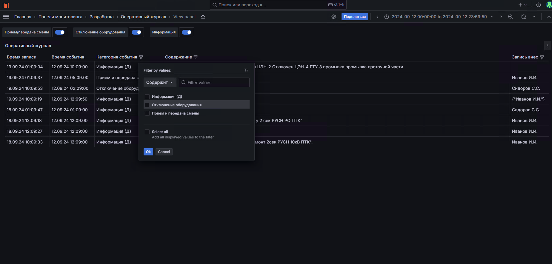 Просмотр журнала в табличном виде предоставляет возможности фильтрации по времени, фильтрации по значениям категории, фильтрации по персоналу, сделавшему запись.