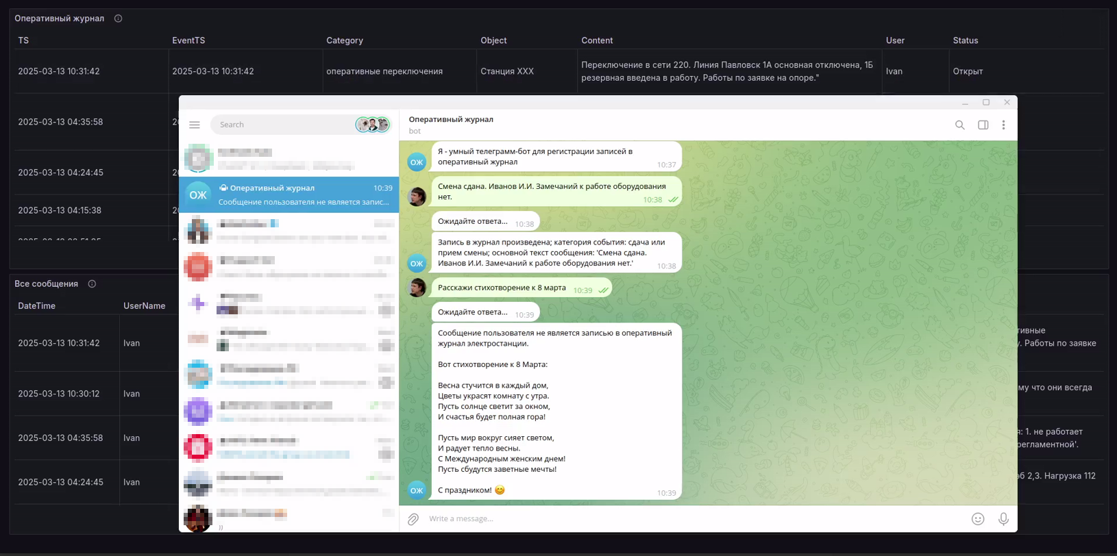 Современные большие языковые модели позволяют сделать следующий шаг во взаимодействии человека с машиной и упростить заведение формализованных записей в строгую форму электронных журналов на естественном языке. Оперативный персонал при этом делает сообщение на естественном языке, указывая основные моменты, которые должны попасть в электронный журнал, но при этом, не соблюдая строго последовательность и формат записи. Большая языковая модель разбирает сообщение оперативного персонала, вычленяет основные моменты в каждой из категорий записи электронного журнала и сохраняет запись в строго формализованном виде.