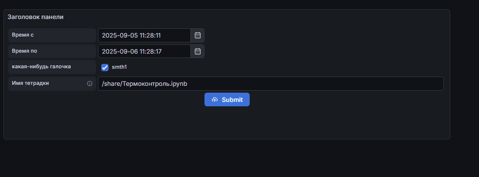 Кроме того, есть возможность связывания созданных python-ноутбуков с интерфейсами Grafana. Для этого в платформе разворачивается специальный сервис, реализующий API для запуска ноутбуков с возможностью передачи пользовательских параметров из Grafana в python ноутбук. Результатом выполнения расчета в ноутбуке могут быть как запись в БД, так и сформированные отчеты excel, выгрузка в форматы csv, excel или другие.