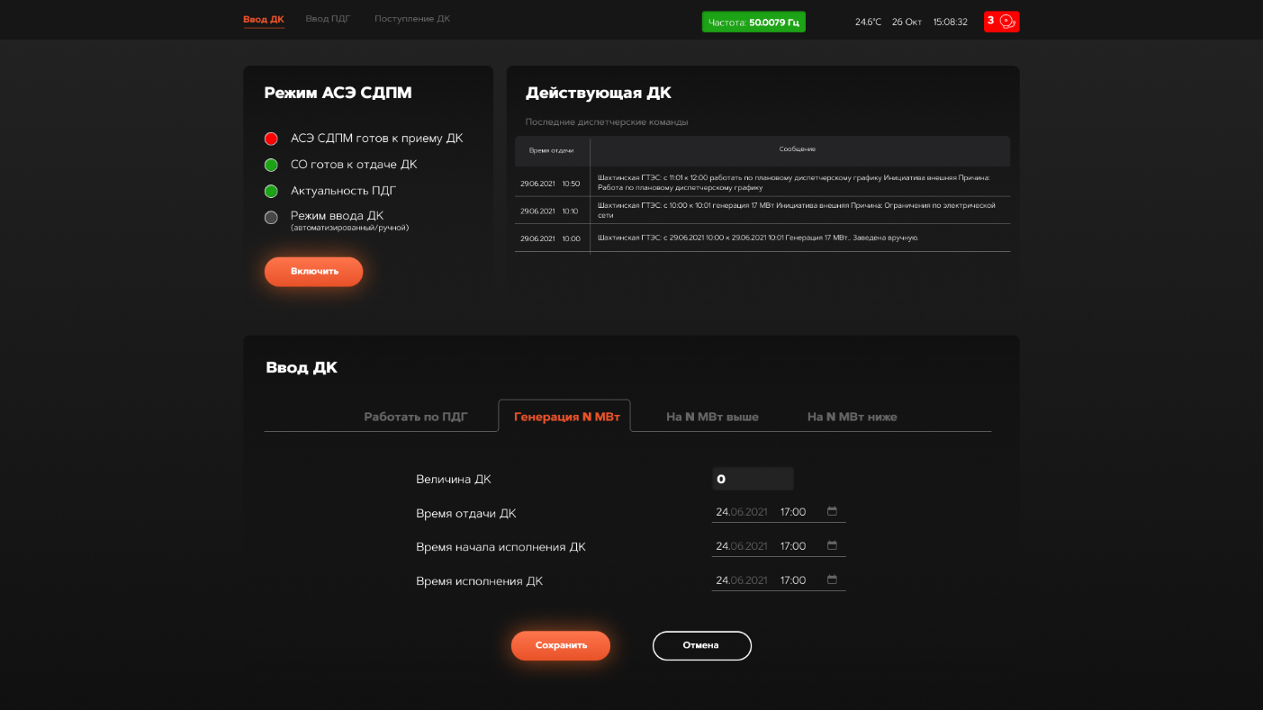 Рисунок 2. Выбор режима и ручной ввод ДК.